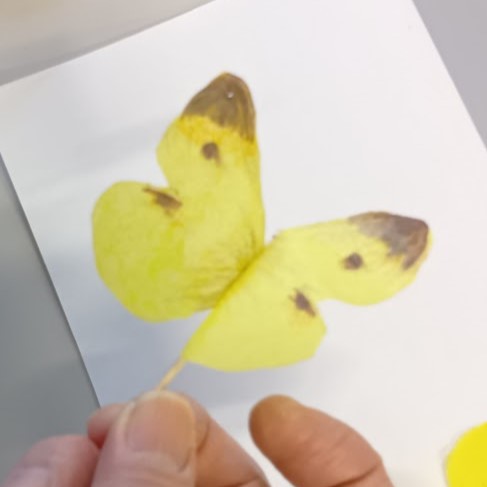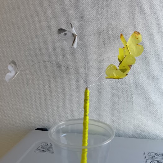 ③菜の花の上に、フラワーペーパーで作った蝶々を飛ばせて、菜の花に動きをだしました。