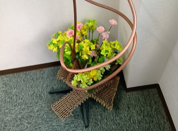 ①クリスマスツリーの台を土台に菜の花と桃の花の造花をパッキング用のクッション材に差して固定します。