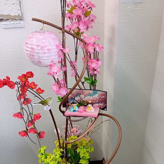 やわらかなピンクの花や小さなお雛様が並び、入り口がパッと明るくなりました。