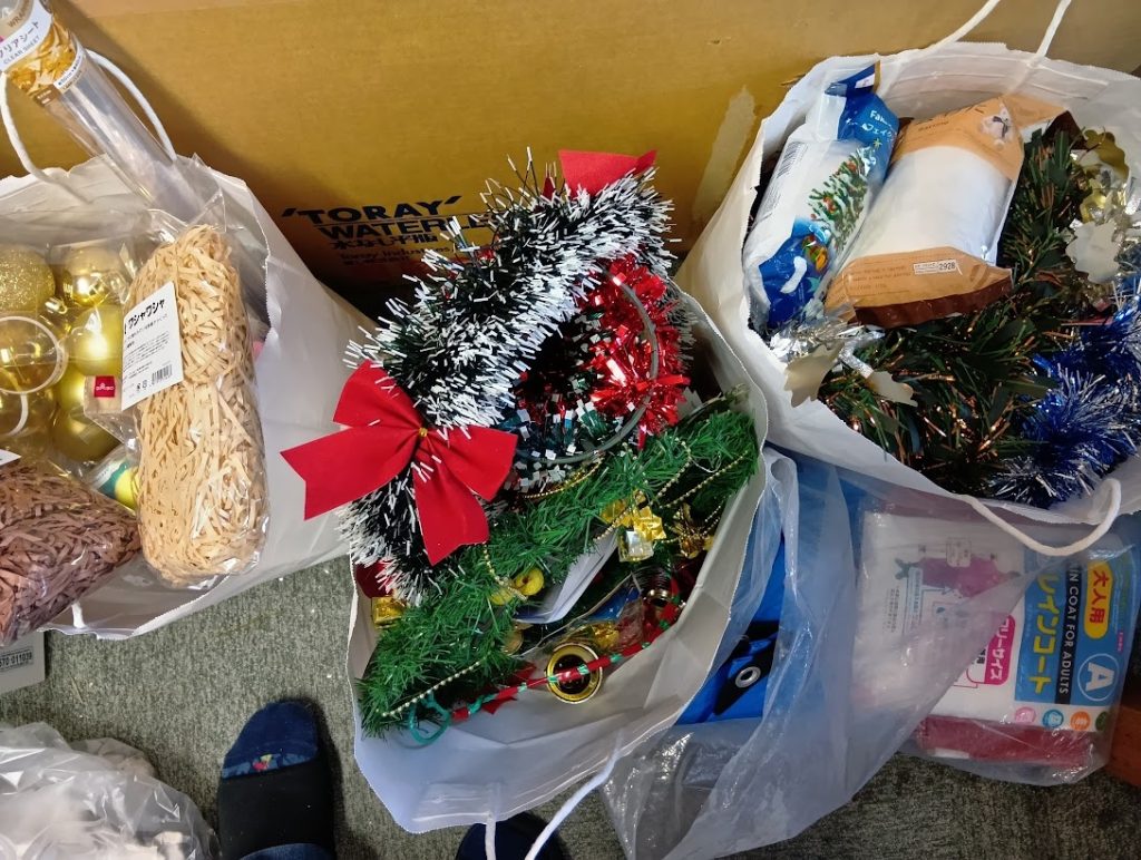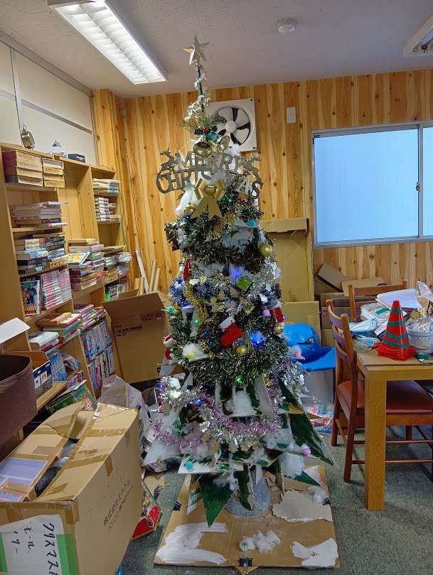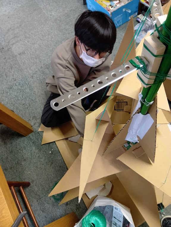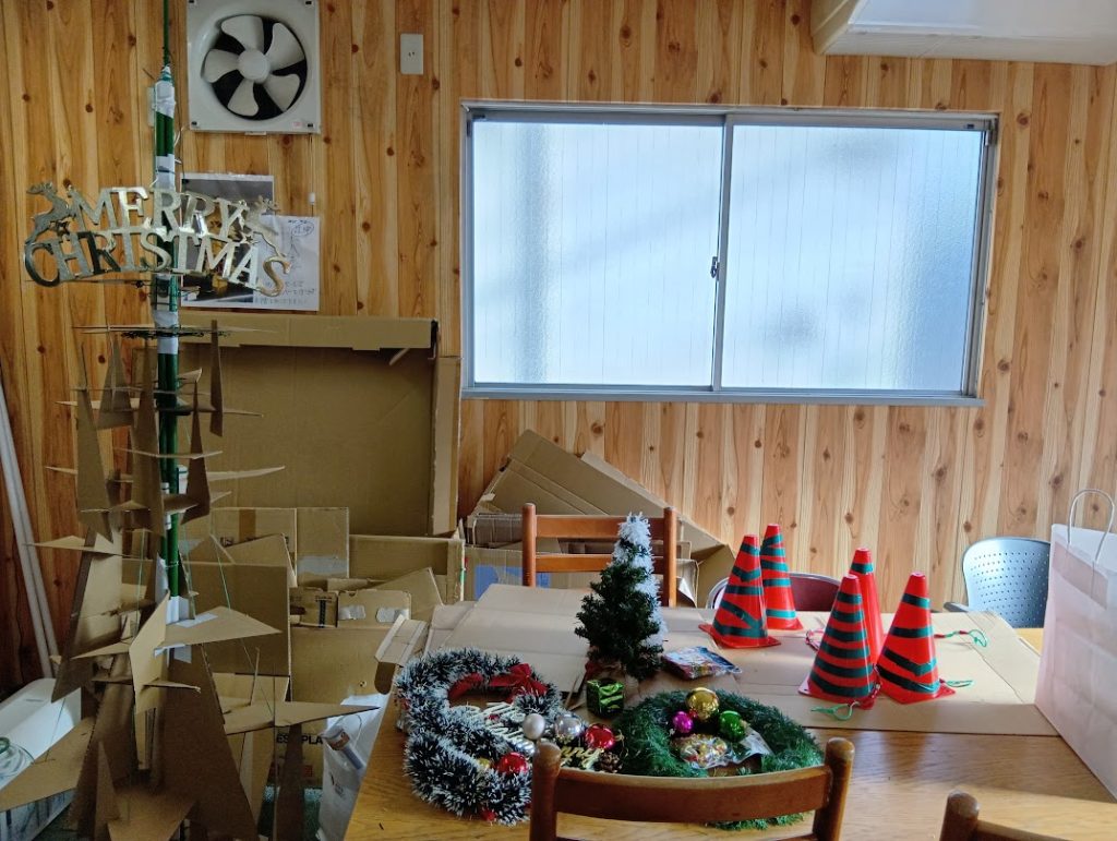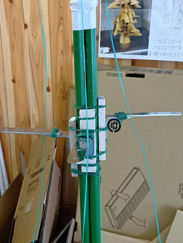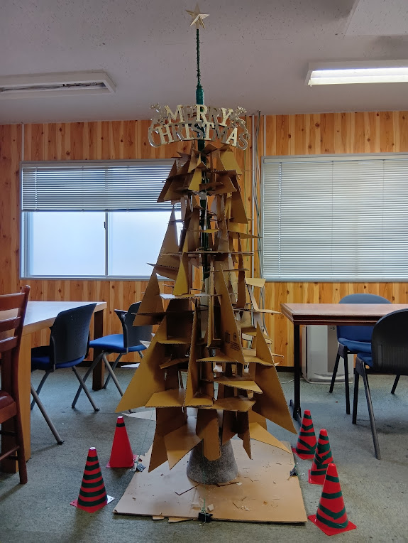 クリスマスツリーは不用なダンボールを利用して、高さ2mぐらい。軸には、ガーデン用のポールを利用しています。12月の初めに完成予定です。