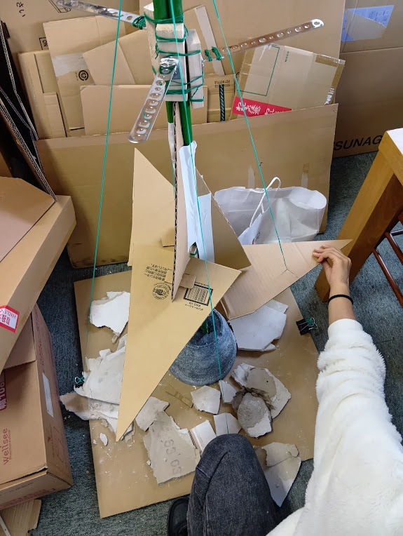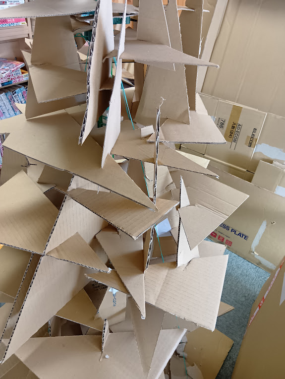 三角形の段ボールを十字に組み合わせながら上に積み上げていき全体にツリーの形になる様に仕上げます。