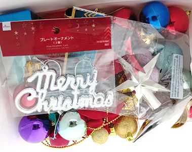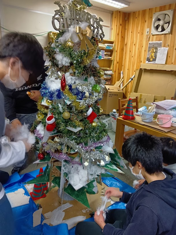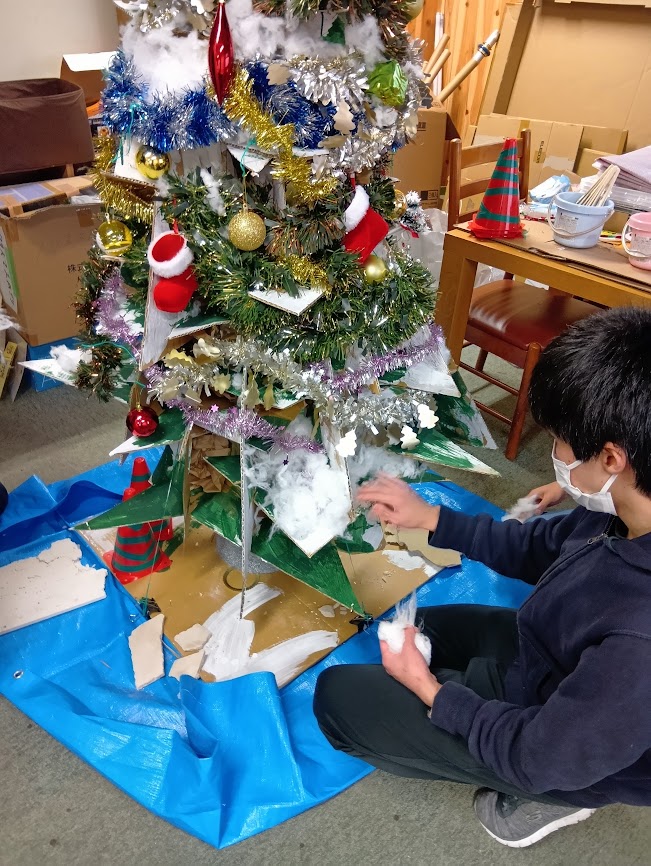 ⑤段ボールのツリーに色々な飾りつけをしていき最後にイルミネーションをつけて完成しました。