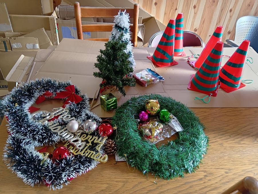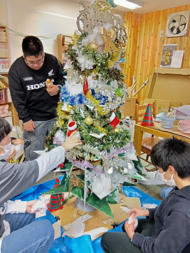 野江のワークセンターでは、現在水曜日の絵画教室の時間を利用して「クリスマスツリーやリース」をみんなで作っています。