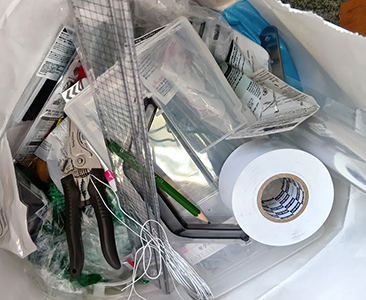 ②ダンボール片(三角片)をおさえる土台としてL字金具と直線金具を組み合わせてポールに固定します。